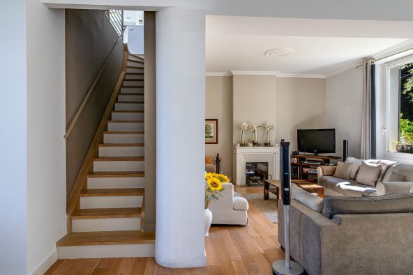 On the garden level, a second, potentially self-contained space includes a veranda arranged as a sitting room, a kitchen, a relaxation area, and two additional bedrooms, each with its own en-suite shower or bathroom. With its own entrance and direct access to the garden, this area is perfect for hosting guests or creating an independent apartment.