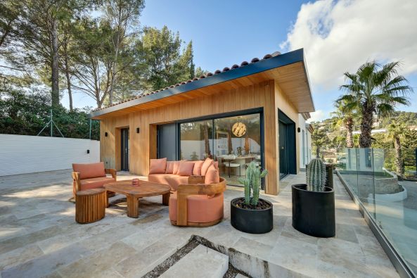 A panoramic rooftop terrace reveals open views with a glimpse of the sea and offers a spectacular outlook over Cap Canaille—a unique setting for entertaining at sunset or enjoying privileged moments.